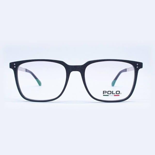 1. C-1: Montura en acetato negro mate con detalles en verde en las bisagras y logo Polo en la varilla izquierda.