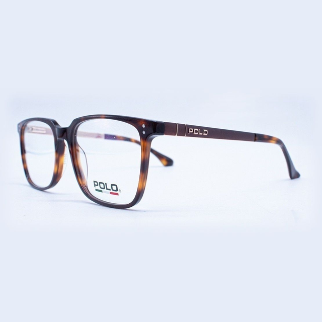 2. C-2: Montura en acetato marmolado marrón con varillas en tono oscuro y logo Polo en la varilla izquierda.