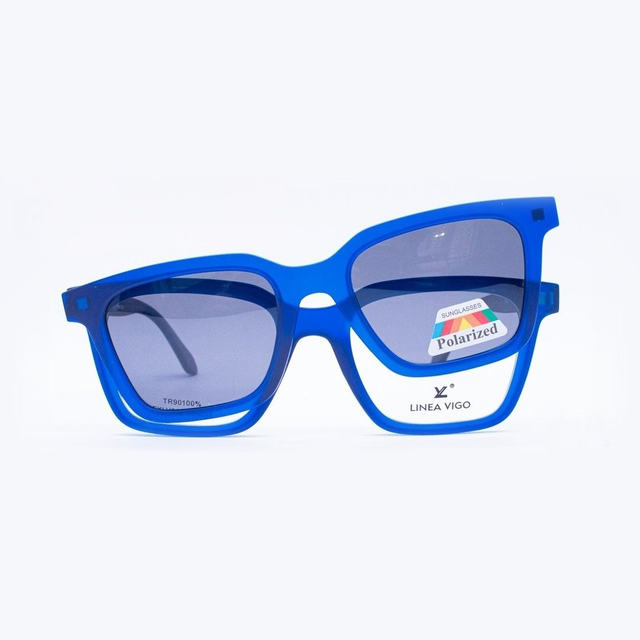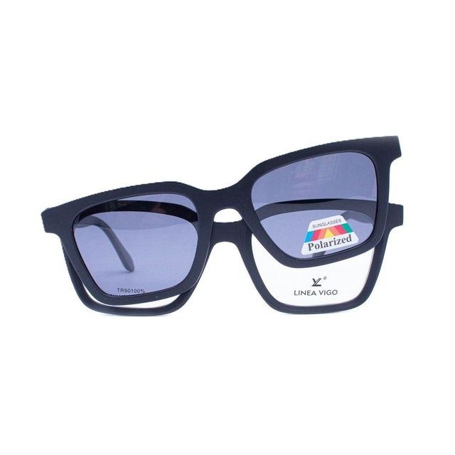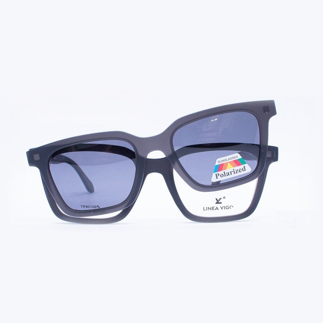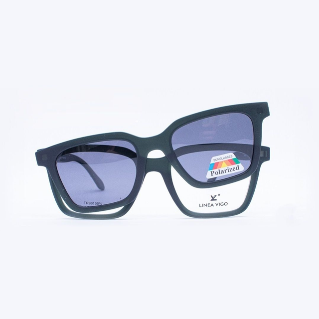 Admira el armazón Linea Vigo FXLV-014, un diseño rectangular moderno compatible con lentes ópticos y equipado con un clip-on polarizado extraíble. Fabricado en TR90, ofrece ligereza y durabilidad para uso diario.