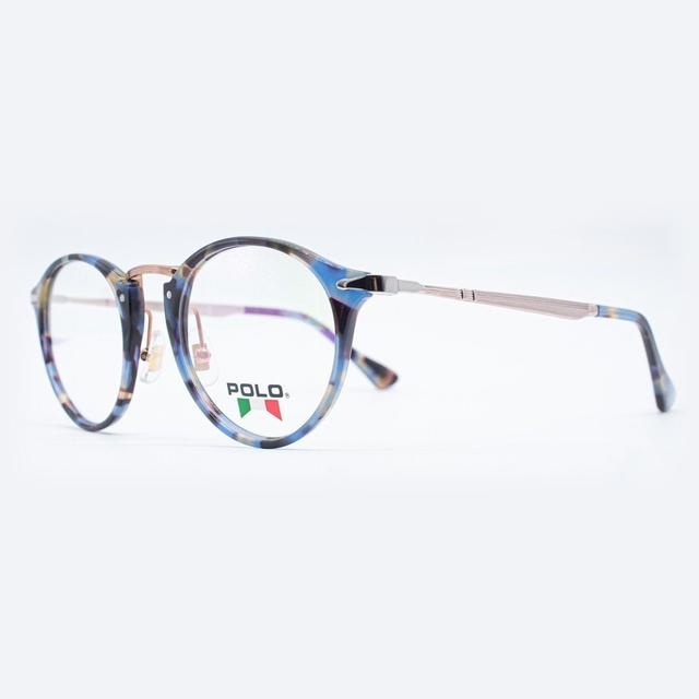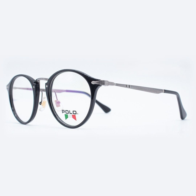 Armazón Polo redondo de acetato color negro. Patas plateadas con terminación envejecida. Diseño vintage que nunca pasa de moda.